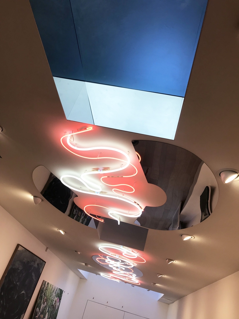 Sculpture lumière, création pour le plafond d'une galerie privée à Paris. Composer - pour ce lieu destiné à présenter surtout des peintures - une sculpture lumière sans fonction d'éclairage technique mais qui anime le plafond quand la galerie n'est pas en action. Cet ensemble d'arabesques, de courbes et contre-courbes contraste avec la rigueur de l'architecture.Travaillant sur les thèmes de l'illusion, du reflet, de la perception, ce chemin de lumière accueille des formes miroir où se reflètent à la fois la sculpture même et l'espace de la galerie. Un miroir comme objet d'aberration perspective : ouverture du plafond vers les cieux et reflet de la Terre.
