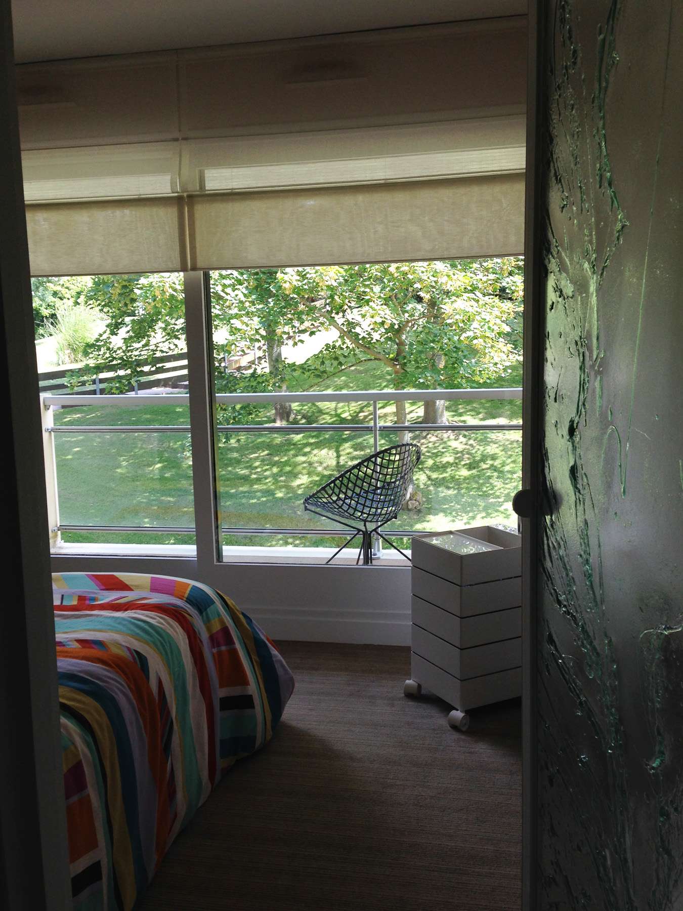Un volume à créer, un nouveau lieu de villégiature, rempli d’espoir. Une échappée, vivifiante, libre. Depuis la salle de bain au miroir pastillé de lumière, une porte en verre texturé s’ouvre sur des arbres mouvants.