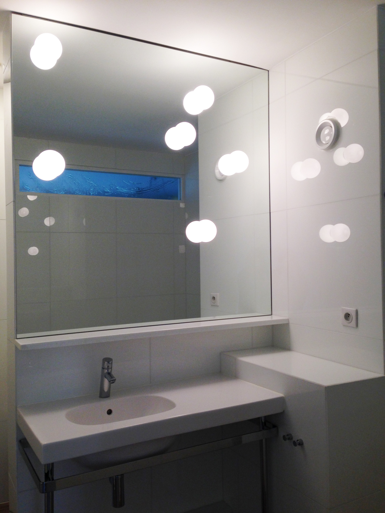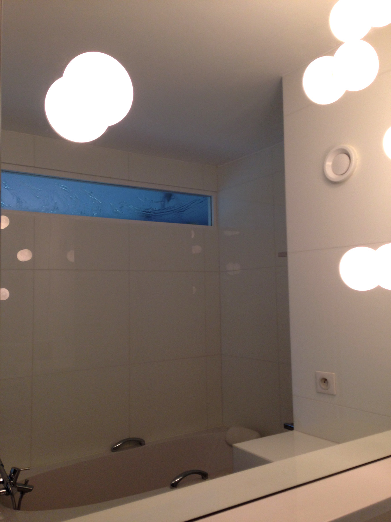 Un miroir de loge où les boules de lumière reprennent leur liberté ! Reflet l’imposte surplombant la baignoire.