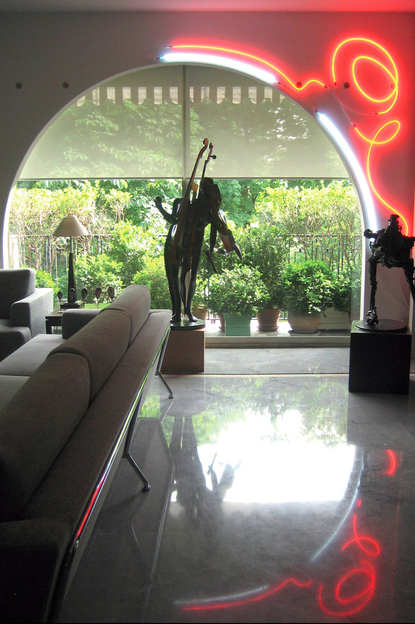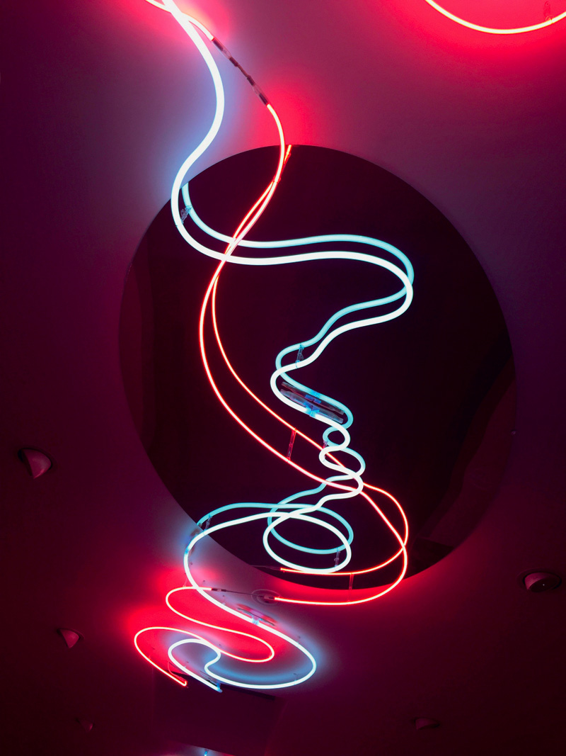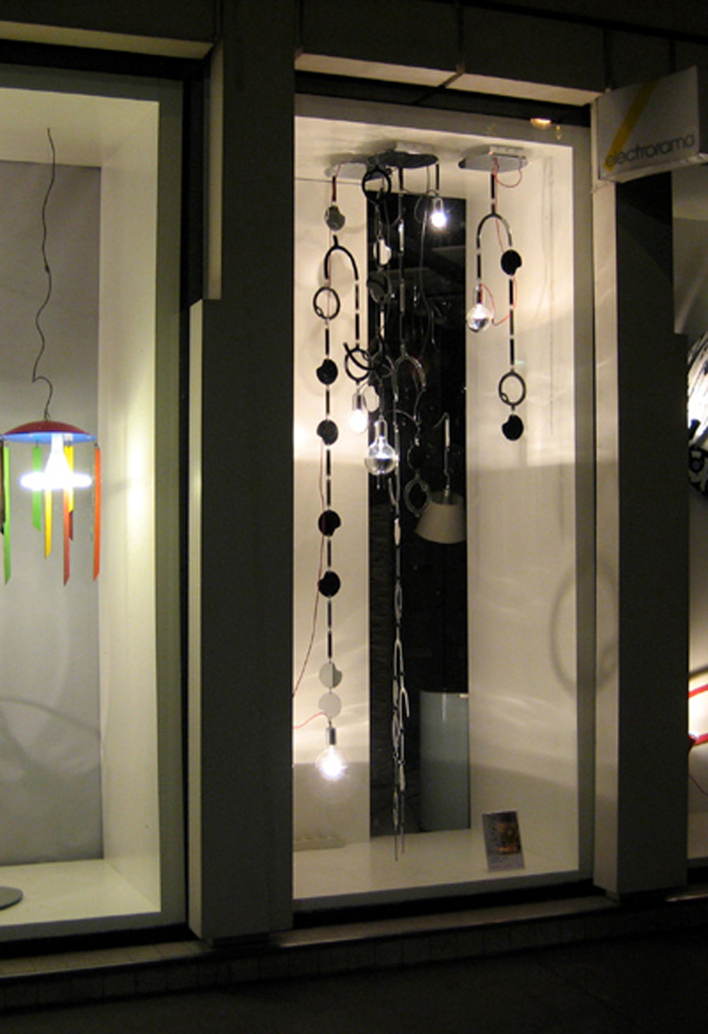 Sculpture lumière, création pour le plafond d'une galerie privée à Paris. Composer - pour ce lieu destiné à présenter surtout des peintures - une sculpture lumière sans fonction d'éclairage technique mais qui anime le plafond quand la galerie n'est pas en action. Cet ensemble d'arabesques, de courbes et contre-courbes contraste avec la rigueur de l'architecture.Travaillant sur les thèmes de l'illusion, du reflet, de la perception, ce chemin de lumière accueille des formes miroir où se reflètent à la fois la sculpture même et l'espace de la galerie. Un miroir comme objet d'aberration perspective : ouverture du plafond vers les cieux et reflet de la Terre.