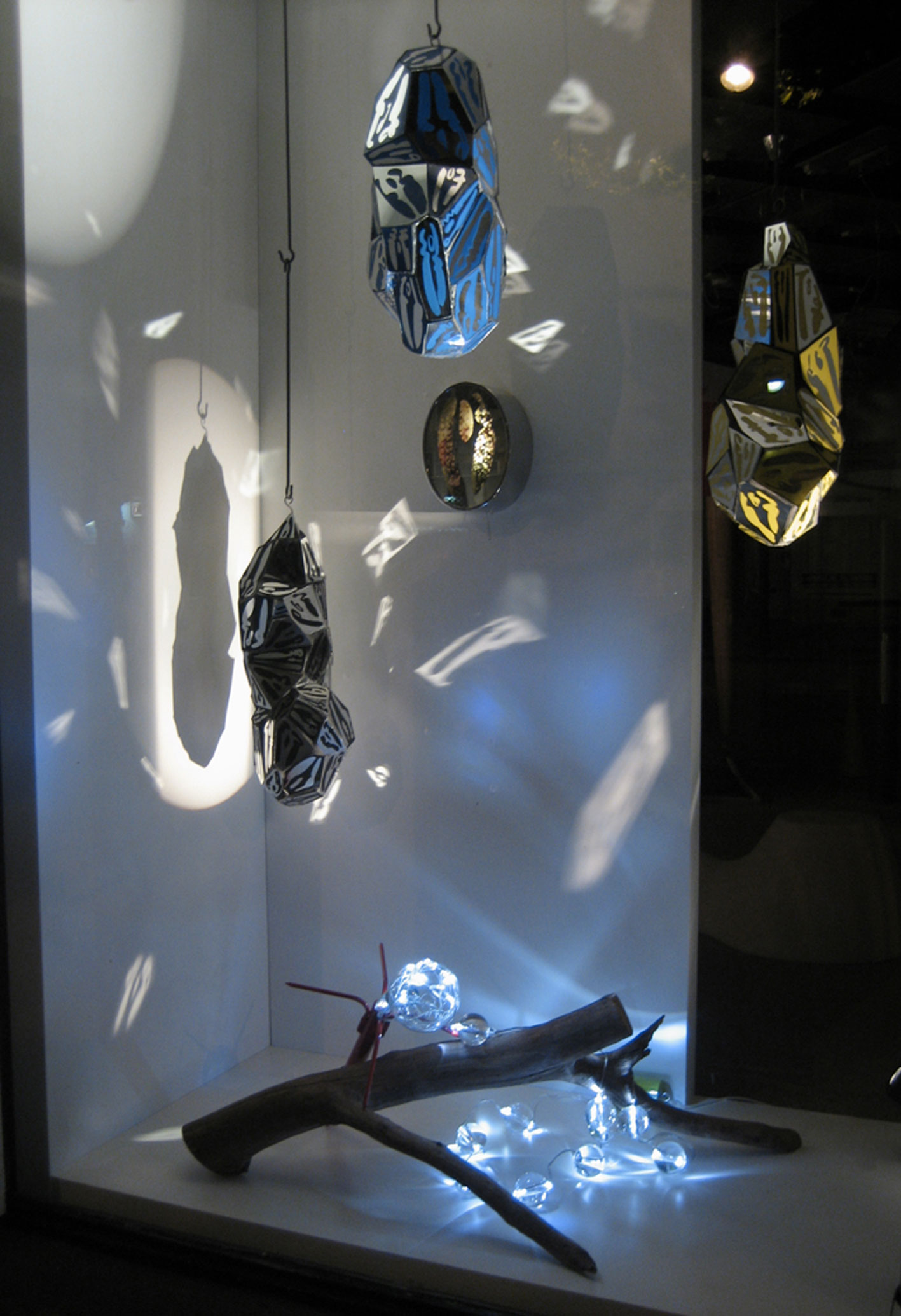 Hélène Lhote utilise en 1998, pour la première fois, la lumière électrique pour éclairer de façon ciblée ses Cocons miroitants puis, en 2001, elle l'intègre dans Ovni, une série d'œuvres associant inox poli miroir, miroir et miroir sans tain. Ces expérimentations se radicalisent en 2005 à la suite d'une rencontre avec la société parisienne Electrorama spécialisée dans l’éclairage.